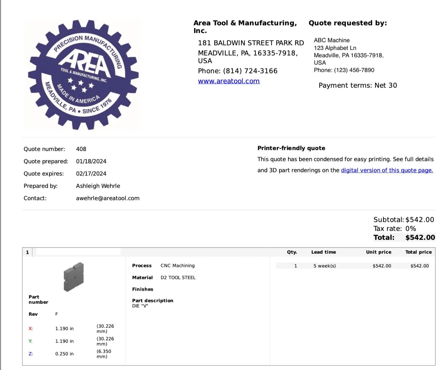 Area Tool Blog CD Archery Ashleigh Wehrle 9/12/25 CD Archery Ashleigh Wehrle 9/12/25 The History of CD Archery: A Story of Innovation and American Manufacturing Read More Material Selection Ashleigh Wehrle 8/20/25 Material Selection Ashleigh Wehrle 8/20/25 Why We Recommend Hardened A2 for Tight-Tolerance Machining Read More DFM Ashleigh Wehrle 6/9/25 DFM Ashleigh Wehrle 6/9/25 Design for Manufacturability: 4 Design Choices to Lower Your Machining Costs Read More Partnership Ashleigh Wehrle 5/14/25 Partnership Ashleigh Wehrle 5/14/25 Pushing the Limits of Our Capabilities to Tackle Complex Machined Parts Read More Partnership Ashleigh Wehrle 4/7/25 Partnership Ashleigh Wehrle 4/7/25 Build a More Resilient Domestic Supply Chain With Vendor-Managed Inventory Read More Wire EDM Ashleigh Wehrle 3/7/25 Wire EDM Ashleigh Wehrle 3/7/25 How Our Wire EDM Services Deliver Faster Parts at Lower Costs Read More CD Archery Ashleigh Wehrle 1/18/25 CD Archery Ashleigh Wehrle 1/18/25 Archery Innovation: Adding Dampeners to CD Archery’s WF29XO Read More Ashleigh Wehrle 12/10/24 Ashleigh Wehrle 12/10/24 Mastering the Craft of Precision Surface Grinding for Flawless Results Read More Ashleigh Wehrle 11/12/24 Ashleigh Wehrle 11/12/24 The CD Archery Acquisition, One Year Later: The Unexpected Rewards of Our Customer Loyalty Read More Ashleigh Wehrle 10/4/24 Ashleigh Wehrle 10/4/24 5 Tips for a Less Stressful Buying Process Read More Ashleigh Wehrle 9/12/24 Ashleigh Wehrle 9/12/24 Don’t Wait Too Long to Involve Your Manufacturing Partner in Your Project Read More Ashleigh Wehrle 8/13/24 Ashleigh Wehrle 8/13/24 Manufacturing Is Alive and Thriving in Crawford County, Pennsylvania Read More Ashleigh Wehrle 7/16/24 Ashleigh Wehrle 7/16/24 5 Details to Include in Your CNC Machining Quote Request Read More Ashleigh Wehrle 6/12/24 Ashleigh Wehrle 6/12/24 What Machine Shops Want You to Know about Planning Machine Upgrades Read More Ashleigh Wehrle 5/13/24 Ashleigh Wehrle 5/13/24 Expanding Our CNC Machining Services to Better Serve Customers Read More Ashleigh Wehrle 4/4/24 Ashleigh Wehrle 4/4/24 An Adaptable Precision Machining Partner for Innovative Customers Read More Ashleigh Wehrle 3/6/24 Ashleigh Wehrle 3/6/24 Plating Solutions for Precision Machined Parts Read More Ashleigh Wehrle 2/9/24 Ashleigh Wehrle 2/9/24 Beyond CNC Machining: Our Full Range of Capabilities Read More Ashleigh Wehrle 1/8/24 Ashleigh Wehrle 1/8/24 Will Your Precision Machining Partner Be around in 10 Years? Read More Ashleigh Wehrle 12/13/23 Ashleigh Wehrle 12/13/23 Small-Town Manufacturing Hits the Bullseye with the Best Barebow Risers Read More Older Posts